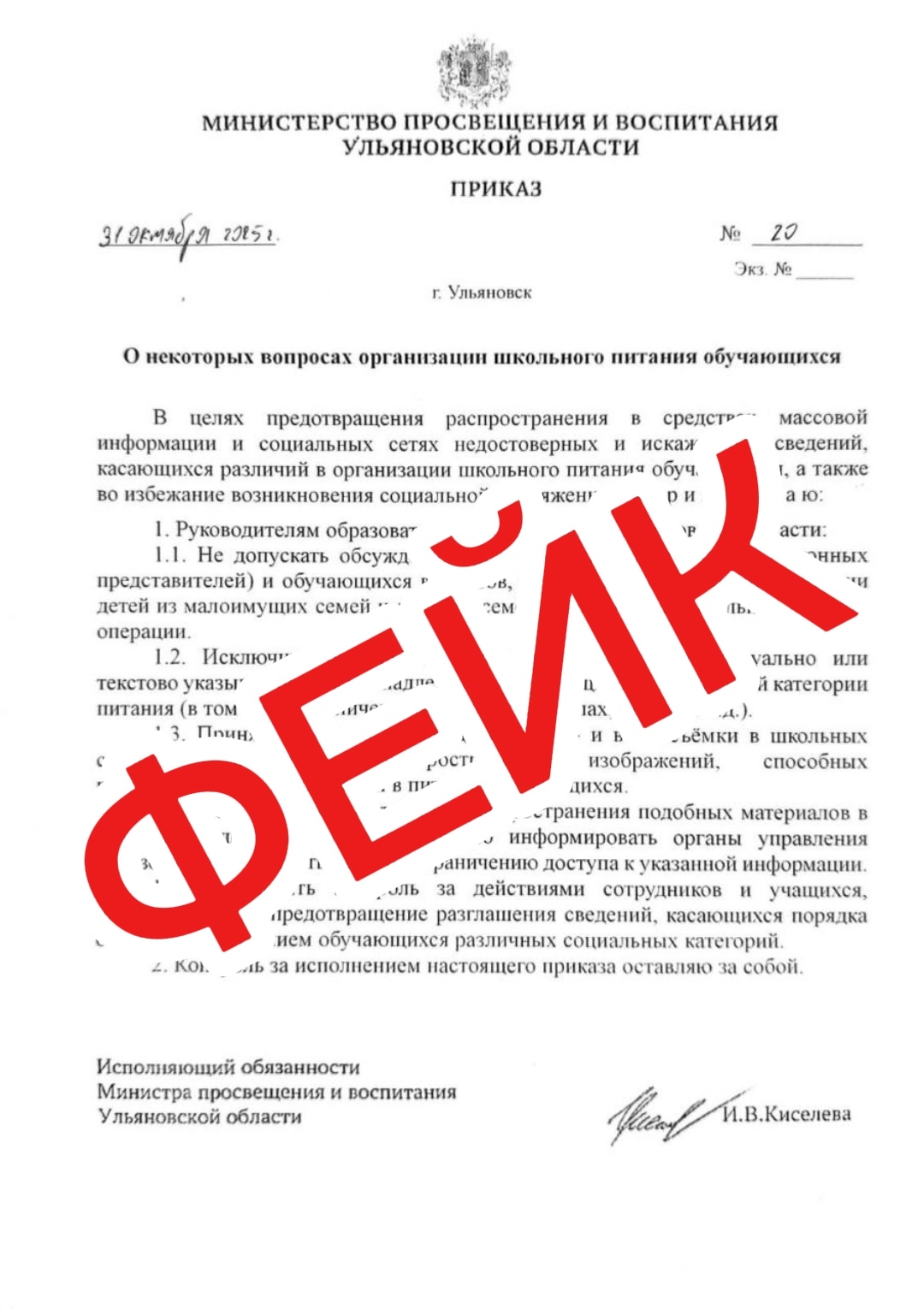 По информации Центра управления регионом, злоумышленники решили вбросить очередной фейк, на этот раз в сфере образования. ЦУР зафиксировал фальшивый приказ Министерства просвещения и воспитания Ульяновской области «О некоторых вопросах организации школьного питания обучающихся», согласно которому запрещается обсуждать в соцсетях различие школьного питания детей из малоимущих семей и семей участников СВО.