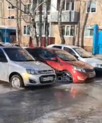 На улице Рябикова после коммунальной аварии автомобили вмерзли в лед: видео