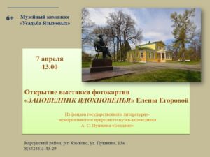 7 апреля в 13.00 в Музейном комплексе «Усадьба Языковых» состоится открытие выставки «Заповедник вдохновенья» фотохудожника Елены Николаевны Егоровой из собрания Государственного литературно-мемориального и природного музея-заповедника А.С. Пушкина «Болдино».