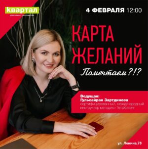 МАСТЕР-КЛАСС ПО СОСТАВЛЕНИЮ КАРТЫ ЖЕЛАНИЙ. Помечтаем?!? «Человеку мечты нужны не меньше, чем воздух» Эльчин Сафарли Любому человеку важно знать свои истинные желания и двигаться к их исполнению. Карта желаний — отличный инструмент для их визуализации и свершения. План мастер-класса: Спикер : Гульсайран Зартдинова -сертифицированный, международный инструктор методики ТетаХилинг • 4 февраля Длительность: 4 часа Стоимость: 888 рублей Участие по предварительной регистрации у Гульсайран Зартдиновой Количество мест ограничено. ‼С собой важно принести Вашу недавнюю фотографию, на которой Вы улыбаетесь, и распечатать картинки, символизирующие Ваши мечты. Бумага и канцелярские принадлежности предоставляются. |