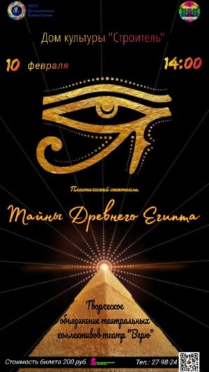 10 февраля в 14.00 в Доме культуры «Строитель» творческое объединение театральных коллективов театр «Верю» представляет пластический спектакль «Тайны Древнего Египта».