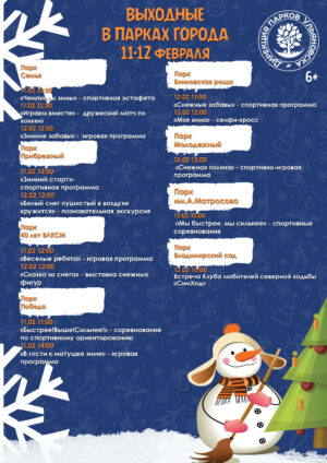 12 февраля в 10:00 в парке «Владимирский сад» состоится традиционная встреча клуба любителей северной ходьбы «СимХод», а в «Винновской роще» с 11:00 будет организована спортивно-развлекательная программа «Снежные забавы». Аналогичные программы пройдут в полдень в парках «Молодёжный», «Семья» и имени Александра Матросова. Для гостей парка 40-летия ВЛКСМ будет представлена выставка снежных фигур «Сказка из снега».