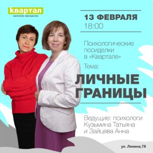 ЛИЧНЫЕ ГРАНИЦЫ На встрече ведущие-психологи будут говорить о личных границах, которые есть или нет. Если их сформировали у детей, то они чувствуют, отстаивают, оберегают, бережно относятся как к своим так и другим. Неважно у кого, детей или взрослых их не сформировали, они обижают, обижаются, делают, то что не хотят делать, не могут отличить «моë» или «не моë», опаздывают и обманывают, небрежно относятся к мнению, чувствам, поступкам других, не отстаивают свои, являются объектом издевательств. В нашей культуре не принято бережно относиться к другим, а значит их границам, их всегда хотят нарушить и заставить делать, что надо другим: пойти не важно куда, поступить в ВУЗ, вовремя выйти замуж, жениться или родить ребëнка и плевать на наше «хочу» — «не хочу». Есть границы личные, дружеские, социальные, публичные. Но если не чувствуются, не выстроены личные, то всё остальные будут западать. У кого-то границы, отделяющие моё (Я) от окружающих могут быть за десятиметровым глухим забором под замком, а у кого-то очень прозрачные и размытые, а у кого-то всегда «дверь нараспашку». Кто может к вам постучать и войти, а кто никогда? На встрече через упражнения и провокации со стороны ведущих, будут исследоваться свои и границы окружающих. Ведущие: психологи Татьяна Кузьмина и Анна Зайцева. • 13 февраля Стоимость участие 500 руб. Регистрация под постом. |