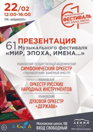 22 февраля в ТРЦ АКВАМОЛЛ пройдет презентация 61-го Музыкального фестиваля «МИР, ЭПОХА, ИМЕНА…» В преддверии Дня Защитника Отечества на сцене ТРЦ АКВАМОЛЛ для вас выступят музыкальные коллективы Ульяновской областной филармонии! Приглашаем вас насладиться прекрасной живой музыкой 22 февраля с 12:00 до 16:00 |