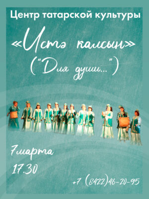7 марта в 17.30 в Центре татарской культуры (проспект Нариманова, 25) состоится концерт «Истә калсын» (“Для души…”), посвящённый Международному женскому дню. В программе: песни из репертуара Народной и Заслуженной артистки Республики Татарстан Хании Фархи в исполнении татарского фольклорного ансамбля «Урама» и лауреатов межрегиональных конкурсов.