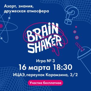 Начни весну с участия в Brainshaker! 16 марта состоится третья игра интеллектуального турнира Brainshaker, которую сеть ИЦАЭ организует в 19 городах. Участников ждут уже знакомые пять туров заданий на логику и эрудицию. Не боитесь сразиться в интеллектуальной битве с эрудированными командами со всей страны? Тогда рассказываем, как принять участие: Всем удачи! Напоминаем, что команды, которые примут участие минимум в трёх играх и в своих городах станут лидерами по количеству набранных баллов, смогут посоревноваться в финале BrainShaker. Время: 18:30 |