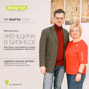 МАСТЕР-КЛАСС «ЖЕНЩИНА В БИЗНЕСЕ. КАК БЫТЬ СЧАСТЛИВОЙ В СЕМЬЕ И РЕЗУЛЬТАТИВНОЙ В БИЗНЕСЕ?» Проведут мастер-класс Андрей Дуров и Оксана Дурова, которые основали Крепкая и здоровая семья, Образовательный центр. Основная цель образовательного центра – помочь окружающим людям формировать и поддерживать целостную картину Мира через ценности семьи. Объяснить, как сохранить и приумножить здоровье – физическое, психическое, эмоциональное. В образовательном центре проходят практические мастер-классы, семинары и тренинги для мужчин, женщин и родителей. На мастер-классе вы узнаете: • Достаточно ли нам ресурсов для счастливой жизни? • 17 марта Вход — свободный! Регистрация: у Андрея Дурова в любом мессенджере (Telegram, WhatsApp, Viber) по номеру телефона +7 905 349 3396 |