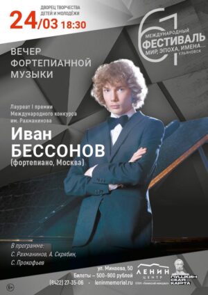 24 марта во Дворце творчества детей и молодёжи с сольной программой выступит Иван Бессонов (фортепиано, Москва) — лауреат I премии Международного конкурса композиторов, пианистов и дирижёров им. Рахманинова (2022), один из наиболее ярких российских пианистов молодого поколения. В программе прозвучат фортепианные произведения Сергея Рахманинова, Александра Скрябина и Сергея Прокофьева Иван Бессонов родился в 2002 году в г. Санкт-Петербург. В 2021 году окончил Центральную музыкальную школу при Московской государственной консерватории имени П. И. Чайковского (класс преподавателя В. Пясецкого). В настоящее время является студентом Московской государственной консерватории имени П. И. Чайковского (класс преподавателя В. Пясецкого). В 2015 году дебютировал в кино как профессиональный композитор. В 2016 году представил сольную программу на сцене Мариинского театра (Санкт-Петербург), выступал с оркестром Мариинского театра, Государственным академическим симфоническим оркестром Российской Федерации, Государственным симфоническим оркестром Республики Татарстан, Национальным филармоническим оркестром России, Государственным симфоническим оркестром «Новая Россия», Симфоническим оркестром Государственной академической капеллы Санкт-Петербурга, Новосибирским академическим симфоническим оркестром и многими другими российскими коллективами, сотрудничая с такими выдающимися дирижерами как Валерий Гергиев, Владимир Спиваков, Александр Сладковский, Владимир Федосеев, Ян Латам-Кёниг. Гастрольные выступления пианиста проходят во многих городах России и дальнего зарубежья. Концертный график молодого артиста расписан на годы вперед. Иван Бессонов шесть раз становился обладателем Гран-при на шести ежегодных конкурсах этюдов в музыкальной школе-лицее «Кикины палаты» (2010 – 2015, Санкт-Петербург). Является обладателем Гран-при Международного юношеского конкурса имени Ф. Шопена (2015, Санкт-Петербург), лауреатом Международного конкурса им. А. Рубинштейна «Фортепианная миниатюра в русской музыке» (2016, Санкт-Петербург), лауреатом и обладателем приза зрительских симпатий Первого международного конкурса Grand Piano Competition (2016, Москва), лауреатом Международного конкурса ASTANA РIАNO PASSION-2017 (2017, Астана), лауреатом Второго международного конкурса Grand Piano Competition (2018, Москва), обладателем Гран-при II Всероссийского конкурса молодых музыкантов «Созвездие» (2020). В 2018 году Иван Бессонов стал победителем конкурса Eurovision Young Musicians-2018 (Эдинбург). В 2019 году – обладателем Международной профессиональной музыкальной премии «BraVo» (в номинации «Открытие года»). В 2020 — 2021 – обладателем Российской национальной музыкальной премии «Виктория» (в номинации «Открытие года в классической музыке»). Летом 2022 года Иван Бессонов завоевал I премию и золоту медаль Международного конкурса пианистов, композиторов и дирижеров имени С.В. Рахманинова (Москва).