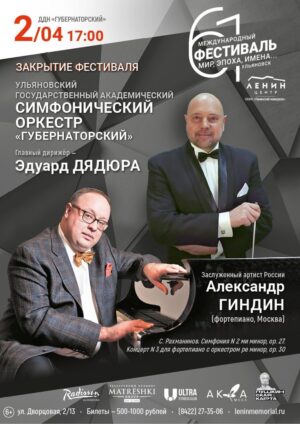 2 апреля к 150-летию со дня рождения Сергея Васильевича Рахманинова в Ульяновске завершится 61 Международный фестиваль «Мир, Эпоха, Имена». В исполнении Ульяновского государственного академического симфонического оркестра «Губернаторский» под управлением главного дирижёра Эдуарда Дядюры прозвучат Вторая симфония и Третий фортепианный концерт Сергея Рахманинова. В программе примет участие заслуженный артист России Александр Гиндин (фортепиано).