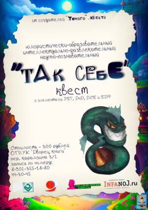 📅8 апреля в 15.00 Дворец книги приглашает искателей приключений пройти юмористически-образовательный, интеллектуально-развлекательный, научно-познавательный «Так Себе» квест с элементами РПГ, ДнД, ДСП и ПДФ!