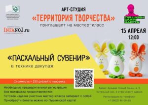 15 апреля в 12:00 — мастер-класс «Пасхальный сувенир» в технике декупаж. Декупаж — старинная техника декорирования предметов прикладного искусства с помощью изображений. Накануне светлого праздника Пасхи участники мастер-класса смогут изготовить оригинальный сувенир, который может украсить ваш дом или стать прекрасным подарком к празднику. Если вы не равнодушны к рукоделию, любознательны и хотите научиться превращать свои фантазии в прекрасные и необычные вещи — добро пожаловать на мастер-классы, где каждый найдёт себе занятие по душе! Необходима предварительная регистрация! Все материалы предоставляются организаторами. Готовое изделие участник мастер-класса забирает с собой. Стоимость участия 250 рублей с человека. Телефон для справок +7 (8422) 44-30-85. |