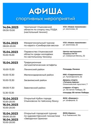 В субботу, 15 апреля, во всех районах города состоится одно из самых масштабных спортивных мероприятий года – легкоатлетическая эстафета. Открытие соревнований и первые забеги пройдут в 9:00 на стадионе «Старт» (ул. 40-летия Победы, 35) в Заволжье. После чего спортивные состязания перейдут на площадь 50-летия победы. В Ленинском районе старт соревнованиям дадут на площади Ленина, в Засвияжском – около Дворца спорта «Татьяна-Арена» (пр-т Олимпийский, 7), а в Железнодорожном – на площади ККК «Современник» (ул. Луначарского, 2а). Начало торжественных открытий – в 10:00. 15 и 16 апреля в 10:00 в физкультурно-оздоровительном комплексе «Фаворит» (ул. Шоферов, 12) состоится открытый кубок города по тайскому боксу, а в ФОК «Орион» (б-р Львовский, 10а) – двухдневный городской турнир по художественной гимнастике «Звездочки Ориона», начало – в 9:00 и 10:00 соответственно.