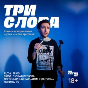 📎 Воскресенье 16/04 — «Три слова»: комедийно-импровизационное шоу, где зрители называют по одному слову, а комики, импровизируя, рассказывают на них шутки.
