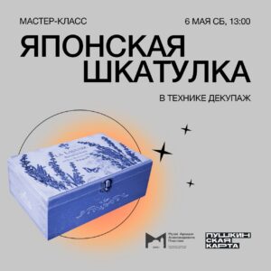 6 мая, 13:00 | Мастер-класс «Японская шкатулка в технике декупаж» | Музей Аркадия Пластова Декупаж — технический приём аппликации для декорирования мебели, предметов быта и украшений, посуды и елочных украшений. Техника зародилась ещё в пятнадцатом веке в Китае, позже мода на декупаж распространилась во Франции, Англии и Америке. Мы предлагаем вам попробовать сделать своими руками очаровательную японскую шкатулку, которая будет отличным подарком или украшением вашего дома. Все материалы предоставляются музеем. Билеты по ссылке: https://uohm.art/2023/04/28/японская-шкатулка-в-техни.. |