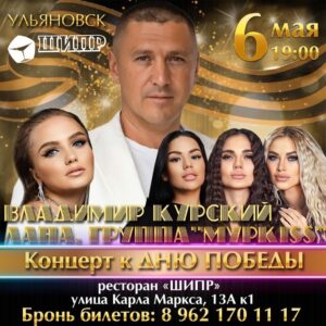 Уважаемые друзья! 6 мая в г. Ульяновск в ресторане «Шипр» состоится праздничный концерт ко Дню Победы в поддержку военных России. Перед вами выступят Владимир Курский, группа «Murkiss», певица Лана. |