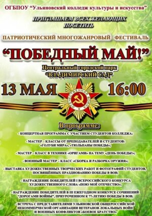 Многожанровый творческий фестиваль, посвященный 78-й годовщине Победы в Великой Отечественной войне, состоится 13 мая в парке «Владимирский сад». Начало – в 16:00. Запланирована концертная программа с участием студентов Ульяновского колледжа культуры и искусства, мастер-классы «Голуби мира», «Тюльпаны мира», военный мастер-класс «Сборка и разборка оружия», а также выставка творческих работ и встреча с ветеранами локальных войн от общественной организации «Боевое братство». В ходе мероприятия пройдет награждение победителей II Всероссийского конкурса художественного слова «Пою моё Отечество!» и IV ежегодного конкурса сочинений «Дорогами войны». Патриотический многожанровый фестиваль «Победный май» проводится с 2020 года. Его основной целью является воспитание духовно-нравственных и патриотических качеств у молодёжи. Многожанровый творческий фестиваль, посвященный 78-й годовщине Победы в Великой Отечественной войне, состоится 13 мая в парке «Владимирский сад». Начало – в 16:00. Запланирована концертная программа с участием студентов Ульяновского колледжа культуры и искусства, мастер-классы «Голуби мира», «Тюльпаны мира», военный мастер-класс «Сборка и разборка оружия», а также выставка творческих работ и встреча с ветеранами локальных войн от общественной организации «Боевое братство». В ходе мероприятия пройдет награждение победителей II Всероссийского конкурса художественного слова «Пою моё Отечество!» и IV ежегодного конкурса сочинений «Дорогами войны». Патриотический многожанровый фестиваль «Победный май» проводится с 2020 года. Его основной целью является воспитание духовно-нравственных и патриотических качеств у молодёжи. |