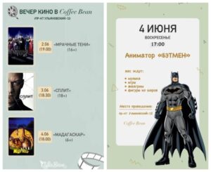 «Coffee Bean» приглашает на выходные: В пятницу, 2 июня в 18:00 вас ждет мастер-класс по созданию скраба и масок из кофейной гущи. Вы узнаете, чем кофе полезен для кожи и бьюти-секреты, которые помогут в уходе за лицом и телом. В 19:00 — просмотр фильма «Мрачные тени» (16+). В субботу, 3 июня в 18:30 — просмотр фильма «Сплит» (18+). В воскресенье, 4 июня в 17:00 развлекательная программа для детей с аниматором Бэтменом. В 18:00 — просмотр анимационного фильма «Мадагаскар» (6+). |