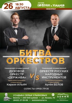 Ульяновский государственный оркестр русских народных инструментов Художественный руководитель и главный дирижёр — Артём Белов Ульяновский государственный духовой оркестр «Держава» Художественный руководитель и главный дирижёр — Кирилл Ильин Солисты оркестров На музыкальном ринге в нешуточной борьбе за овации публики схлестнутся Русский оркестр под управлением Артёма Белова и Духовой оркестр «Держава» под управлением Кирилла Ильина. Мини поединки состоятся между солистами оркестров. Весь блеск виртуозной игры, мощь духовых и удаль народных инструментов обрушатся на Летнюю эстраду, в очередной раз продемонстрировав уникальность и самобытность каждого оркестра и его солистов. Начало концерта в 18:30. С 17:30 для гостей Усадьбы проводятся экскурсионные и выставочные проекты под открытым небом в самом центре исторического Симбирска – на территории Усадьбы семьи Ульяновых. Летом 2023 года они посвящены грядущему 100-летию Дома-музея В.И. Ульянова-Ленина. Сотрудники музея расскажут о родовом гнезде Ульяновых, искусстве реставрации и о судьбах хранителей первого ленинского музея. Для свободного посещения открыта выставочная экспозиция павильона «Гараж СССР. Ретромототехника». Билеты — 250 — 500 рублей |