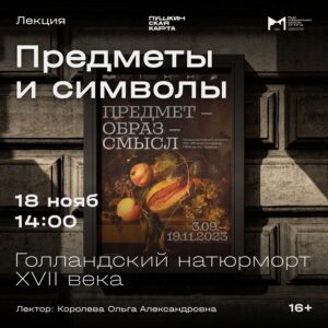 18 ноября, 14:00 | Лекция «Предметы и символы. Голландский натюрморт XVII века» | Музей изобразительного искусства XX-XXI вв. Музей изобразительного искусства ХХ-ХХI вв. приглашает на лекцию, посвященную одному из самых интересных жанров живописи — натюрморту. В ходе беседы участники познакомятся с уникальными произведениями таких художников, как Ян Брейгель Старший, Питер Класс, Балтазар ван дер Аст, Виллем Клас Хеда, Абрахам Миньон ; узнают о скрытой символике композиций, о том, почему в Голландии XVII века натюрморт стали выделять в отдельный жанр изобразительного искусства и как он достиг своего расцвета. Лекция проходит в рамках выставки «Предмет – Образ – Смысл. Западноевропейский натюрморт XVII–XIX веков из собрания Государственного музея изобразительных искусств имени А.С. Пушкина». Билеты по ссылке: https://uohm.art/2023/11/10/предметы-и-символы-голлан.. |