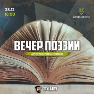 Творческий вечер талантливых и самобытных поэтов нашего города. Поэзия – это музыка, волнующая душу. Сам язык поэзии настраивает на глубокое понимание и внутреннее осмысление происходящего вокруг, поэзия проникает в самые тайные уголки души человека. А для лучшей атмосферы мы создадим непринуждённую обстановку, стирающую границы между выступающими и зрителями.