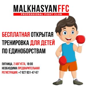 🥊 Внимание! БЕСПЛАТНАЯ открытая тренировка по единоборствам для детей в MALKHASYAN FFC! 🗓 Ждем вас 2 августа в 18:00 ✅ Регистрация по телефону: #MALKHASYANFFC #единоборства #дети #спорт |