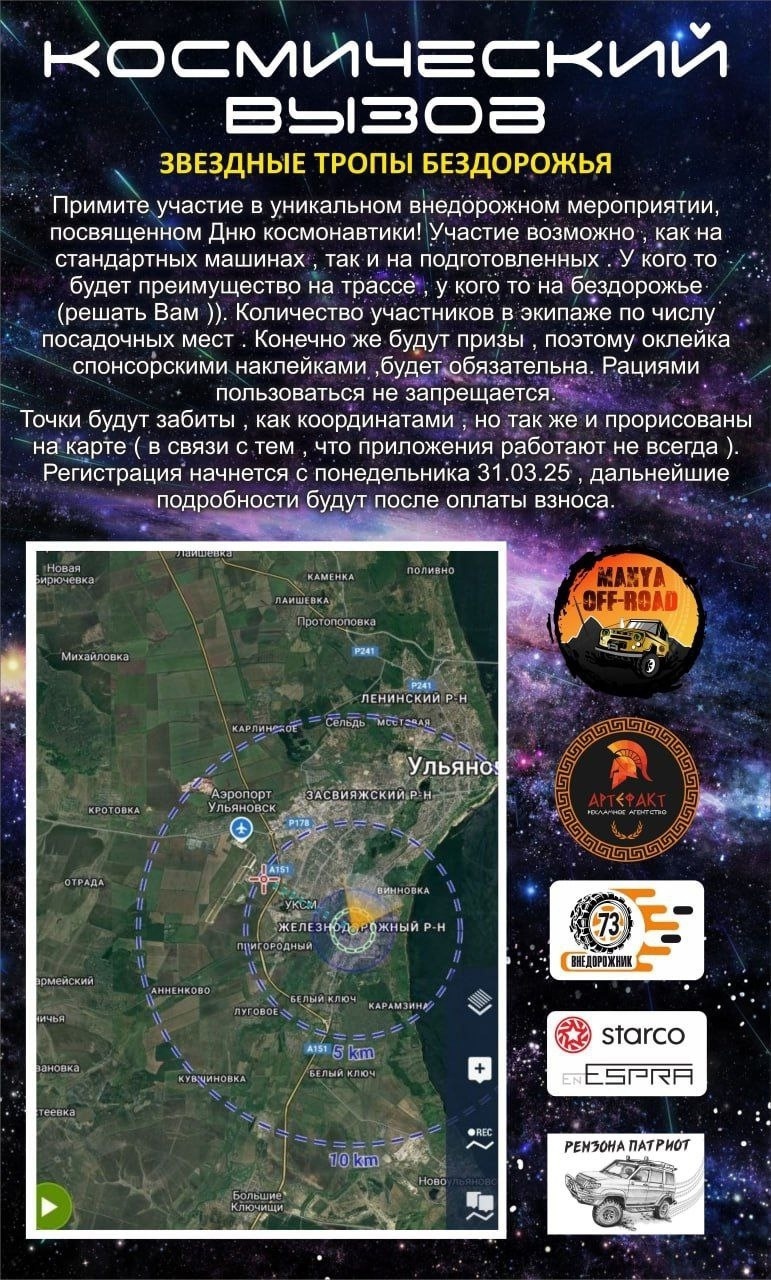 Вы готовы принять «Космический вызов» 12 апреля и пройти солнечную систему нашей области за ценные призы? Это будет увлекательное соревнование, посвященное Дню космонавтики, организованное внедорожным движением «Manya Off-road» Внедорожный клуб «MANYA OFF-ROAD» близь нашего города Ульяновска.
