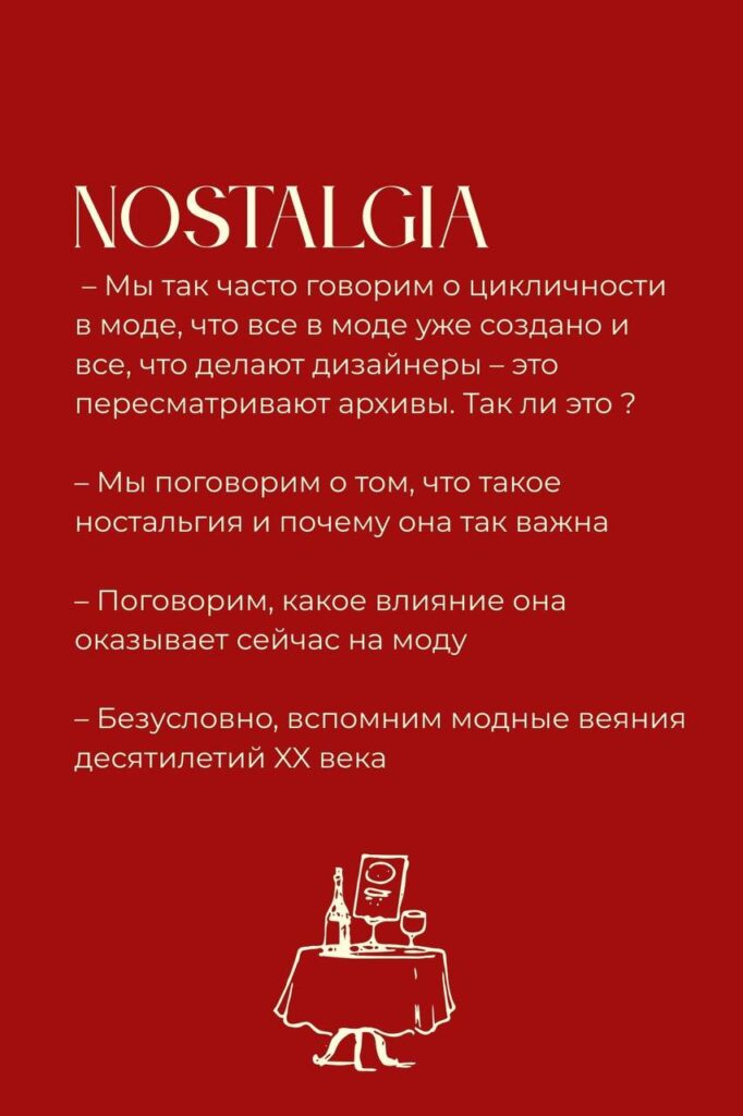 25.04 19:00 FASHION TALK NOSTALGIA Нас так давно не было! За это время пришла весна и пора встречаться, пить шампейн и много говорить о моде. Тем более в этот раз мы будем в невероятно стильном месте! Галерея современного искусства O-CHI 😎Потрясающая студия с красивым видом. Мы будем счастливы, если нам посчастливится застать закат 🩶 В пространстве O-CHI пройдет ужин, посвященный ностальгии в моде. Мы поговорим как HE цикличность влияет на моду, а именно ностальгия. Как именно она диктует правила в моде и поп-культуре. Мы поговорим о ревущих 20х, рок-н-рольных 50х, диско 70х и блестящих 90х, и конечно же, гламурных 00х👠 Мы так часто говорим о цикличности в моде, что все в моде уже создано и все, что делают дизайнеры — это пересматривают архивы. Так ли это ? Мы поговорим о том, что такое ностальгия и почему она так важна. Поговорим, какое влияние она оказывает сейчас на моду. Безусловно, вспомним модные веяния десятилетий XX века💋 Вечер пройдет с шикарным видом на ночной город. Вас будут ожидать напитки, вкуснейшие закуски и шикарно украшенный стол🍝 Стильная джазовая музыка, разговоры о ностальгии в моде, непринужденная беседа, звон бокалов игристого — весна везде и даже в наших сердцах 🌟 — Стильное атмосферное пространство галереи современного искусства Стоимость участия — 2500 (все включено)📞 Мест всего 20🌟 |