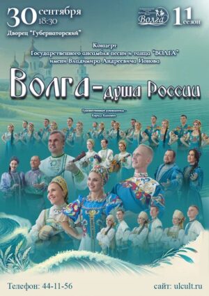 Приглашаем ценителей народного искусства и поклонников ансамбля «Волга» на открытие творческого сезона 30 сентября во Дворец культуры «Губернаторский». «Волга — душа России» — это гимн нашей Родине, который ансамбль «Волга» исполнит для зрителей с любовью и верностью своим традициям.
