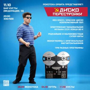 Приглашаем вас на нашу третью, завершающую трилогию вечеринку, Диско Перестройки — андерграундная поп-дискотека, где звучит электронная танцевальная музыка СССР конца 80-х — начала 90-х годов. Легендарные песни столичных и провинциальных групп и исполнителей, незамысловатая романтика и лоу-файные синтезаторы, хард-роковые гитары и песни про неразделенную любовь, быт молодежи позднего СССР, наряду с социальной общественной критикой. Редчайшие и бережно сохранившиеся записи, источниками которых послужили фонограммы магнитоальбомов тех лет, имеющиеся в коллекции бессменного участника проекта Дмитрия. Как всегда, записанный микстейп будет воспроизводится с катушечного магнитофона, харизматично танцующим жокеем. 📅 11 октября Бар Кусты, Федерации, 13 💵Билеты: в предпродаже — 300 р. на входе — 500 р. |
