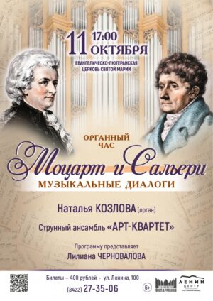 Программу представляет Лилиана Черновалова. В названии программы – тайна, её пронизывает электрическое напряжение: объединились два имени, находящиеся в вечном антагонизме, вечном споре, вечном неразрешимом конфликте. Связанные воедино легендой, они превратились в два мощных символа, которые будоражат умы всех, кто имеет отношение к музыке и в целом к искусству. Эта антитеза, достойная античной трагедии, гораздо старше Моцарта и Сальери и пронизывает всю жизнь людей-творцов. Однако оставим философию. И просто прогрузимся в атмосферу эпохи, в которой жили и творили два великих современника – Моцарт и Сальери. Вольфганг Амадей Моцарт – «бог музыки», гений, равного которому не знал и не знает мир. Он шагнул далеко за грань своего времени, создав музыку – предвестницу будущего. Антонио Сальери – крупный композитор века. Он оставил богатое наследие – своеобразный слепок эпохи, позволяющий нам судить о её вкусах, нравах и пристрастиях. Сальери внёс немалую лепту в развитие итальянской оперы, органной и камерной музыки, создав произведения, достойные внимания потомков. Как авторитетный педагог он воспитал учеников, в числе которых – великие Бетховен, Шуберт и Лист. В жизни Моцарт и Сальери были соперниками. Однако музыка выше земных страстей, она способна примирить даже самых заклятых врагов. И нет более справедливого судьи, чем время, которое сохранило для нас творения обоих композиторов, позволяя через века наслаждаться их неповторимой красотой. В программе: Антонио Сальери. Концерт для органа с оркестром (в переложении для квартета) C-dur, Вариации на тему испанской Фолии Вольфганг Амадей Моцарт. Церковная соната Es-dur, «Ein Andante fur eine kleine Orgel» Жолт Гардоньи. «Mozartchanges» Билеты — 400 рублей
