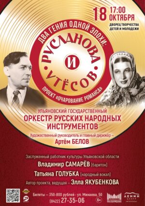 Проект «Очарование романса» Ульяновский государственный оркестр русских народных инструментов Художественный руководитель и главный дирижёр — Артём Белов Заслуженный работник культуры Ульяновской области Владимир Самарёв (баритон) Татьяна Голубка (народное пение) Автор проекта, ведущая – Элла Якубенкова Романсы и лирические песни. Они полны очарования, светлой грусти и искренней радости, идут от всей души. Встреча с ними всегда приятна и желанна. Песни из репертуара Лидии Руслановой и Леонида Утёсова расскажут о чувствах человека, о его любви, радости, счастье, мечтах. Русланова и Утёсов – два разных мира, но их объединяет любовь к музыке, которая говорит с людьми на многообразном языке эмоций. В 2025 году их творчество звучит громче, чем когда-либо. Исполняется 125 лет со дня рождения Лидии Руслановой (27.10.1900- 21.09.1973) и 130 лет со дня рождения Леонида Утёсова (22.03.1895-09.03.1982). На концерте прозвучат жемчужины песенного искусства, отличающиеся особой выразительностью и эмоциональностью. «Осенний сон», «Я на горку шла», «Очаровательные глазки», «Эх, матушка», «Ой, ты степь широкая», «Окрасился месяц» и другие, из репертуара Л. Руслановой; песни И. Дунаевского, А. Кролла, Н. Богословского, Т. Хренникова, Д. Эллингтона из репертуара Л. Утёсова.
