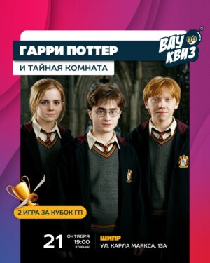 Продолжаем путешествовать по магической Вселенной Джоан Роулинг 🧹 На очереди — второй эпизод в истории о Гарри Поттере, именно ему посвятим новый квиз для всех поттероманов: ⚡21 октября (ВТ) 19:00 — Гарри Поттер и Тайная комната. 2 игра за кубок в «Шипр» (Карла Маркса ул. 13а) О той самой Тайной комнате поговорим в отдельном туре. А ещё посмотрим на вопросы в картинках, в мультимедиа-формате, предложим вам логические задачки и некоторые факты. Объединять их будет одно: на этом квизе мы говорим обо всем, что связано с книгой и фильмом о Гарри Поттере и Тайной комнате🔑 Регистрация в резерв: ulsk.wowquiz.ru/schedule |