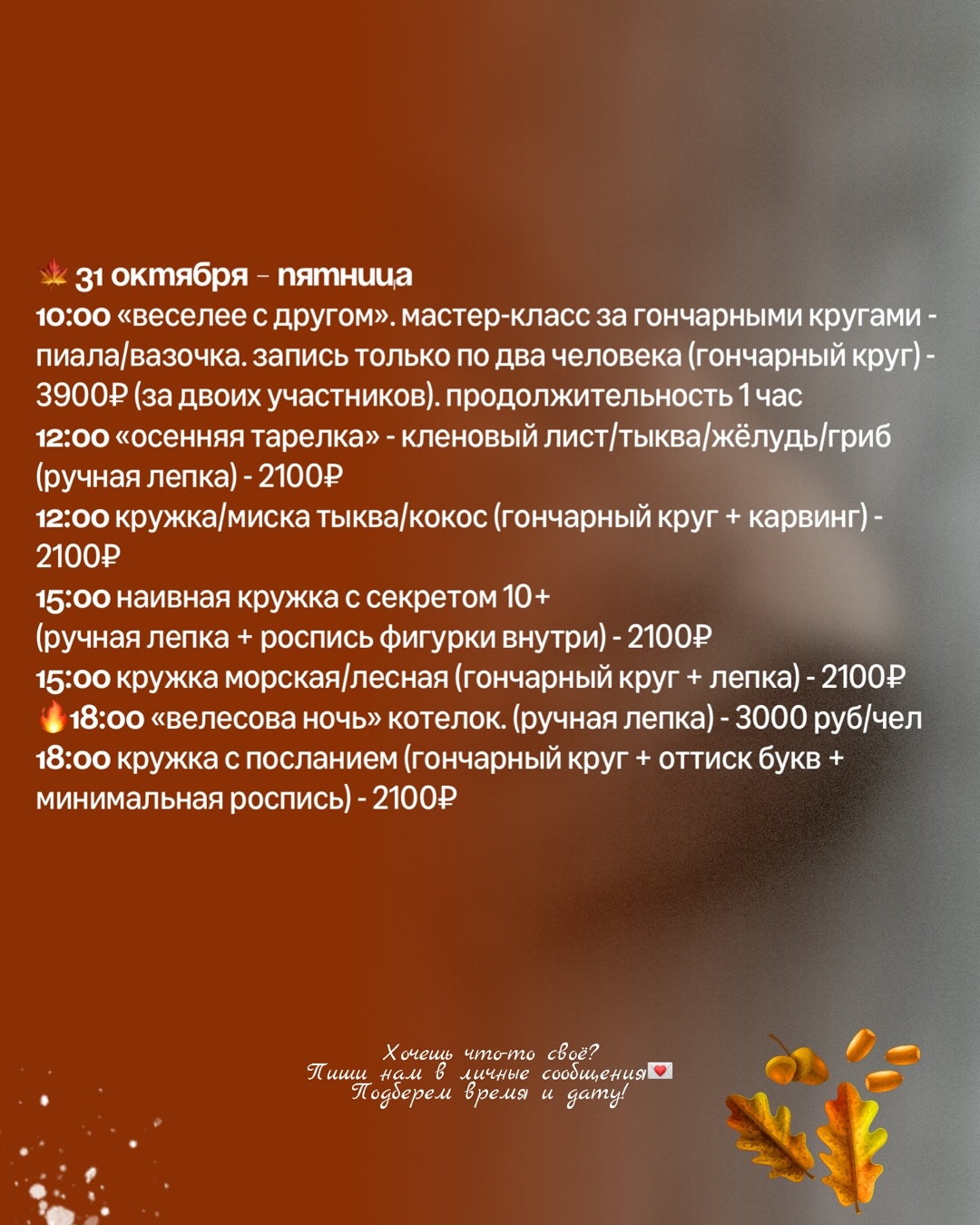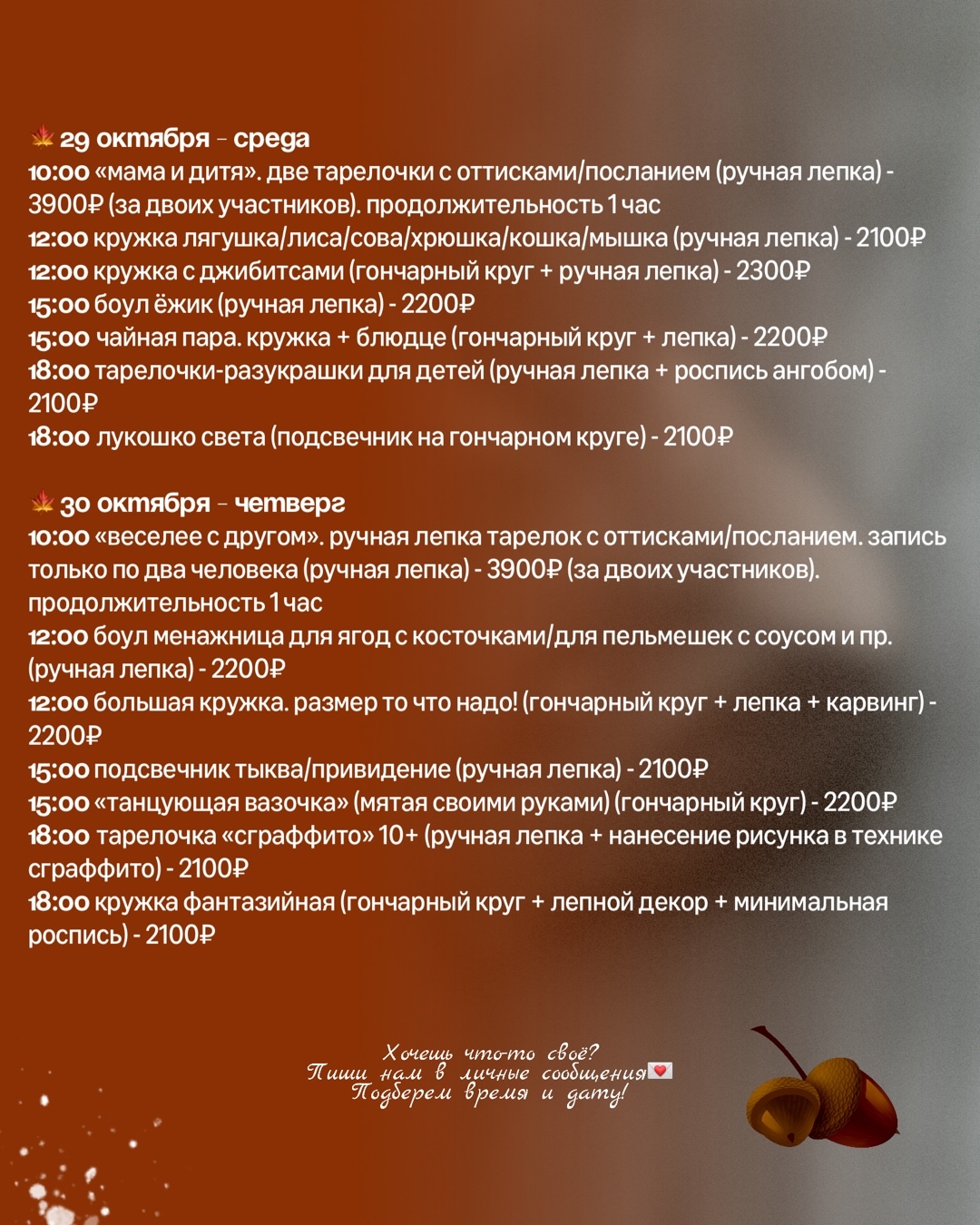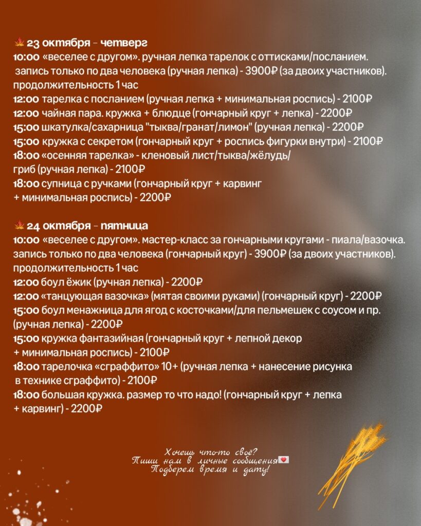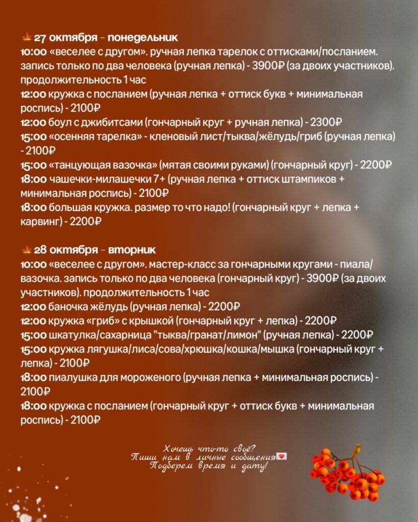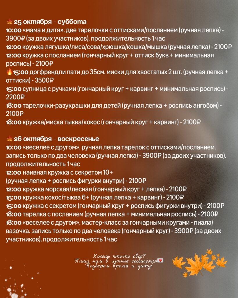 Осень -время творчества и уюта🍂 Выбирайте формат по душе: ▪ лепка кружек, тарелок, вазочек 📌 Важно знать: ✓ Стоимость указана за одного участника 📲 Запись в WhatsApp: +7 (991) 840-11-40 |