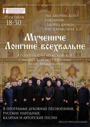 По благословению Митрополита Симбирского и Новоспасского Лонгина в Ульяновске пройдут два концерта Архиерейского мужского хора Симбирской митрополии. В среду 29 октября, в день тезоименитства Владыки, в Зале Дворянского собрания (областной научной библиотеки) в 18-30 будет представлена концертная программа «Мучениче Лонгине всехвальне». Прозвучат духовные песнопения, народные, казачьи, военные песни и популярные сочинения. Второй концерт с этой же программой состоится в пятницу 7 ноября в 18-00 в Заволжье, ДК «Руслан». Вход по пригласительным. |