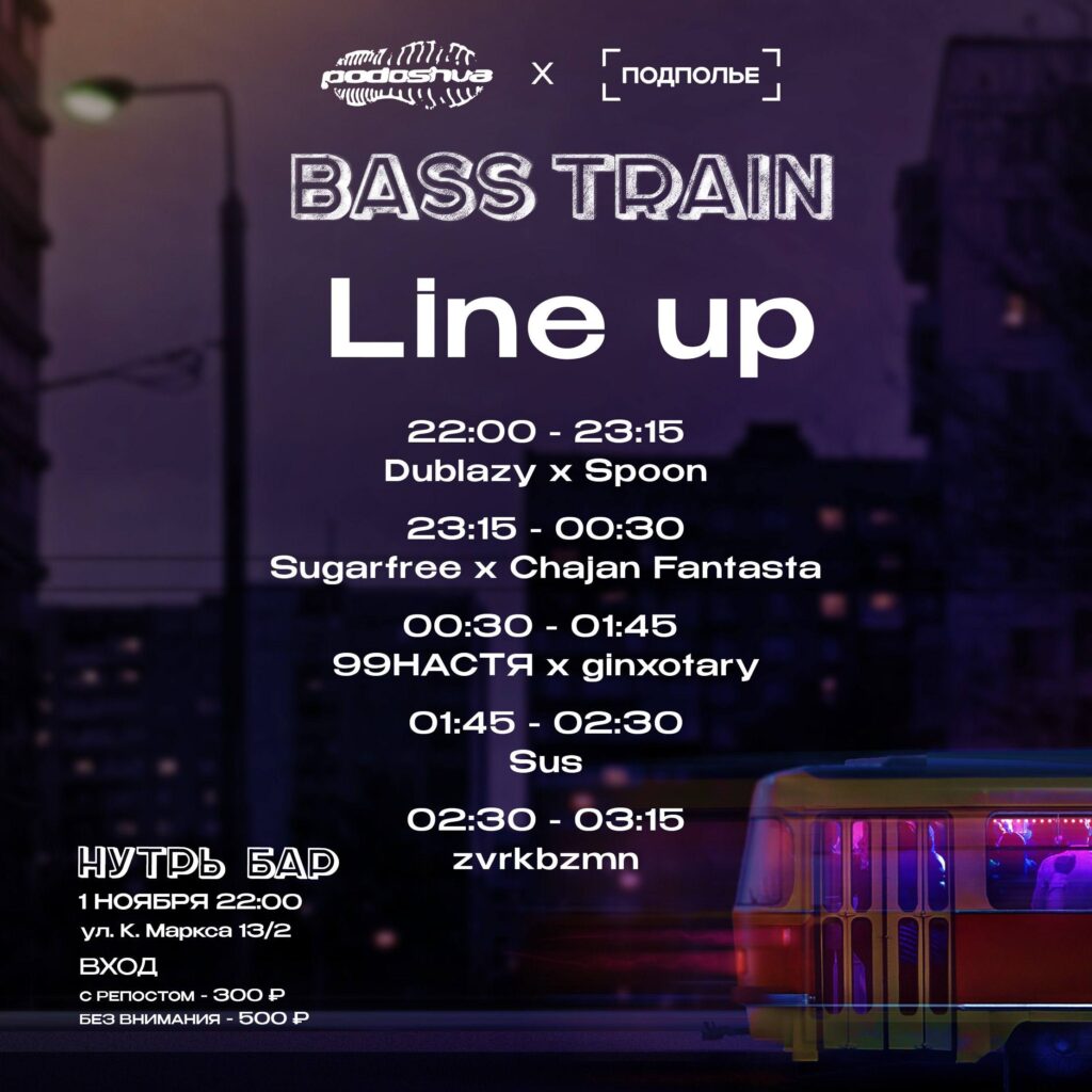 18+ 🚨Podoshva x ПОДПОЛЬЕ 1 ноября в 19:00 запускают ульяновский бейс трамвай от остановки Гостиница Венец. Ждем всех желающих БЕСПЛАТНО прокатиться по городу и потанцевать. Для погружения в атмосферу будут установлены КОЛОНКИ. Маршрут: 🚨Количество мест ограничено — 30 человек, вход строго по записи в этой форме регистрации. Line up: 🚨После препати в 22:00 мы ворвемся в Нутрь бар, где продолжим веселиться под ломаные ритмы. Здесь уже выплеснем всю энергию — музыка будет потяжелее, звук плотный и минимум света, чтобы раскрепоститься в танце! Line up: 🚨 🚨 🚨 ТРАМВАЙ: |  |