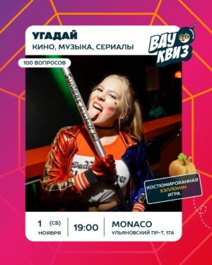 Однажды вы спросите нас, что мы любим больше — музыкальные игры или киноквизы 😎 И так и не узнаете, что больше всего нам нравится, когда вопросы о песнях и фильмах соединяются в одной игре и дополняются какой-нибудь общей крутой темой. Например, как в этот раз: 🎬1 ноября (СБ) 19:00 Угадай кино, музыка, сериалы 100 вопросов в «Monaco» (Ульяновский проспект, 17а) От страшного к смешному в этой игре разбег будет коротким 👻 А ещё зададим вам вопросы из нашей музыкальной и видеоподборки, присмотримся к стоп-кадрам, угадаем слова с дефисом или тире в названии и даже успеем сгонять в недавнее прошлое. Собираемся, наряжаемся, готовимся к ужасно классному вечеру! Регистрация в резерв: ulsk.wowquiz.ru/schedule |
