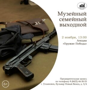 6+ Приглашаем на «МУЗЕЙНЫЙ СЕМЕЙНЫЙ ВЫХОДНОЙ» в Ульяновский областной краеведческий музей имени И.А. Гончарова. | 2 ноября 13:00 – Лекция «Оружие Победы» В ходе лекции сотрудник музея расскажет о вооружении Красной Армии в 1941-1945 гг., среди которого ручной и станковый пулеметы, батальонный миномет и пистолет-пулемёт Шпагина. Занятие проходит в зале «Война. Победа. Память». Экспозиция зала поможет почувствовать атмосферу военного времени и узнать о жизни нашего народа и борьбе с фашизмом в годы Великой Отечественной войны, 80-летний юбилей Победы в которой мы отмечаем в 2025 году. (6+) Стоимость билетов — согласно прейскуранту услуг музея. |  |