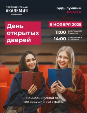Ульяновский филиал Президентской академии приглашает на День открытых дверей Старшеклассников образовательных организаций Ульяновской области ждут 8 ноября по адресу: ул. Радищева, д. 140, корп. 1. День открытых дверей в Ульяновском филиале Президентской академии для выпускников 11-х классов начнётся в 11:00, учащихся 10-х классов – в 14:00. Участники Дня открытых дверей смогут познакомиться с преподавателями, студентами, учебными аудиториями, задать интересующие вопросы сотрудникам приёмной комиссии, узнать о студенческой жизни, определиться с выбором будущей профессии. В этом учебном году Дни открытых дверей будут проходить в новом формате. У гостей Дня открытых дверей будет возможность принять участие в работе интерактивных лабораторий «Лучший в своей профессии». Не упустите возможность познакомиться с Ульяновским филиалом Президентской академии, задать вопросы и почувствовать атмосферу яркой студенческой жизни! Подробности по телефону: (8422) 43-30-65. |