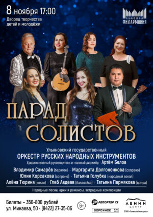 Ульяновский государственный оркестр русских народных инструментов Художественный руководитель и главный дирижёр — Артём Белов Заслуженный работник культуры Ульяновской области Владимир Самарёв (баритон) Маргарита Долгоненкова (сопрано) Юлия Корсакова (сопрано) Татьяна Голубка (народное пение) Алёна Тюрина (вокал) Глеб Авдеев (балалайка) Татьяна Пермякова (домра) Программу представляет Элла Якубенкова Репертуар оркестра русских народных инструментов разнообразен и во многом уникален – народная музыка, авторские произведения, переложения классической и популярной музыки. Каждая программа – событие в мире и инструментальной, и вокальной музыки. Концерт «Парад солистов» – это радость творчества, союз оркестра и солистов филармонии, это романсы и лирические песни, эстрадные композиции и классические арии, инструментальные мелодии, народное пение. Вся эта разножанровая палитра объединена любовью к музыке. Именно она говорит с людьми на многообразном языке эмоций, воплощённом в прекрасных звуках оркестра. В программе народные песни, арии и романсы, эстрадные композиции: Георгий Свиридов. «Время, вперёд!» (в современной обработке) Имре Кальман, либретто Лео Штайн, Бела Йенбах. Выходная ария Сильвы из оперетты «Сильва» Исаак Дунаевский, либретто Виктор Типот, Виктор Винников, Владимир Крахт. «Песенка Пепиты» из оперетты «Вольный ветер» Владимир Шаинский, слова Александр Жигарев. «А он мне нравится» Давид Тухманов, слова Михаила Ножкина. «Есть» Арно Бабаджанян, Андрей Дементьев. «Люблю тебя» Константин Меладзе. «Оттепель» Артем Белов. «Фантазия на тему финской польки» Кацу Хоси. «Еще вчера» Р.н.п. «Порушка» Клод Боллинг. «Фуга» из джазовой сюиты Чик Кориа. «Сеньорита» Генри Манчини, слова Джонни Мерсер. «Moonriver» Пабло Бельтран Руис, Норман Гимбел. «Sway» Уолтер Афанасьев, слова Лара Фабиан. «Brokenvow» Сл. и муз. Боб Кру и Боб Гаудио. «Can’t take my eyes off you» из репертуара Фрэнки Валли