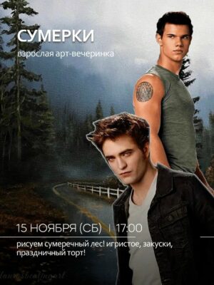 Рисуем таинственный лес на холстах 20*30 (подрамник), пьем винишко, угощаемся закусками, участвуем в тематических конкурсах, получаем подарки, фоткаемся с Эдвардом и Джейкобом, наслаждаемся праздничным тортом и вдохновляемся атмосферой 🧛