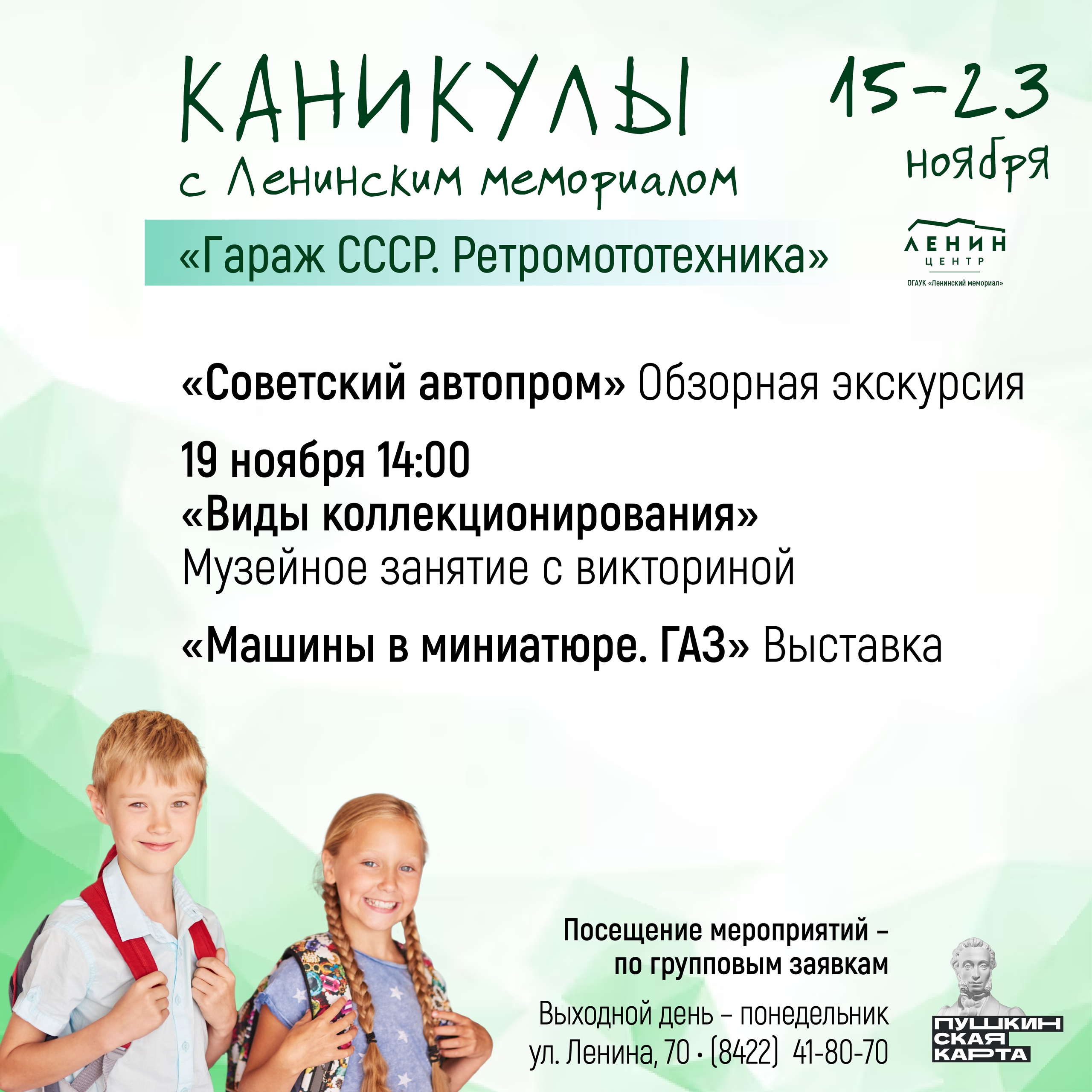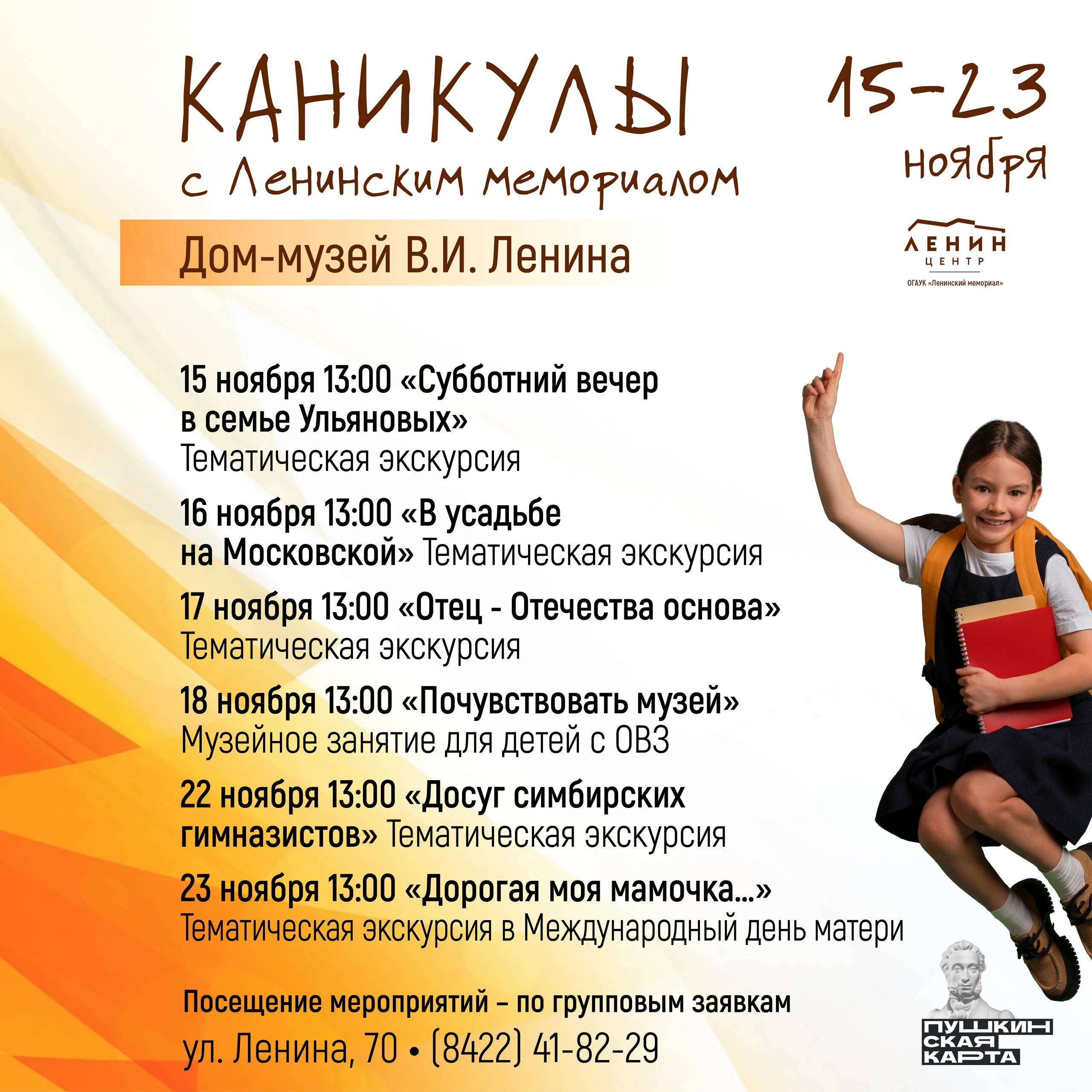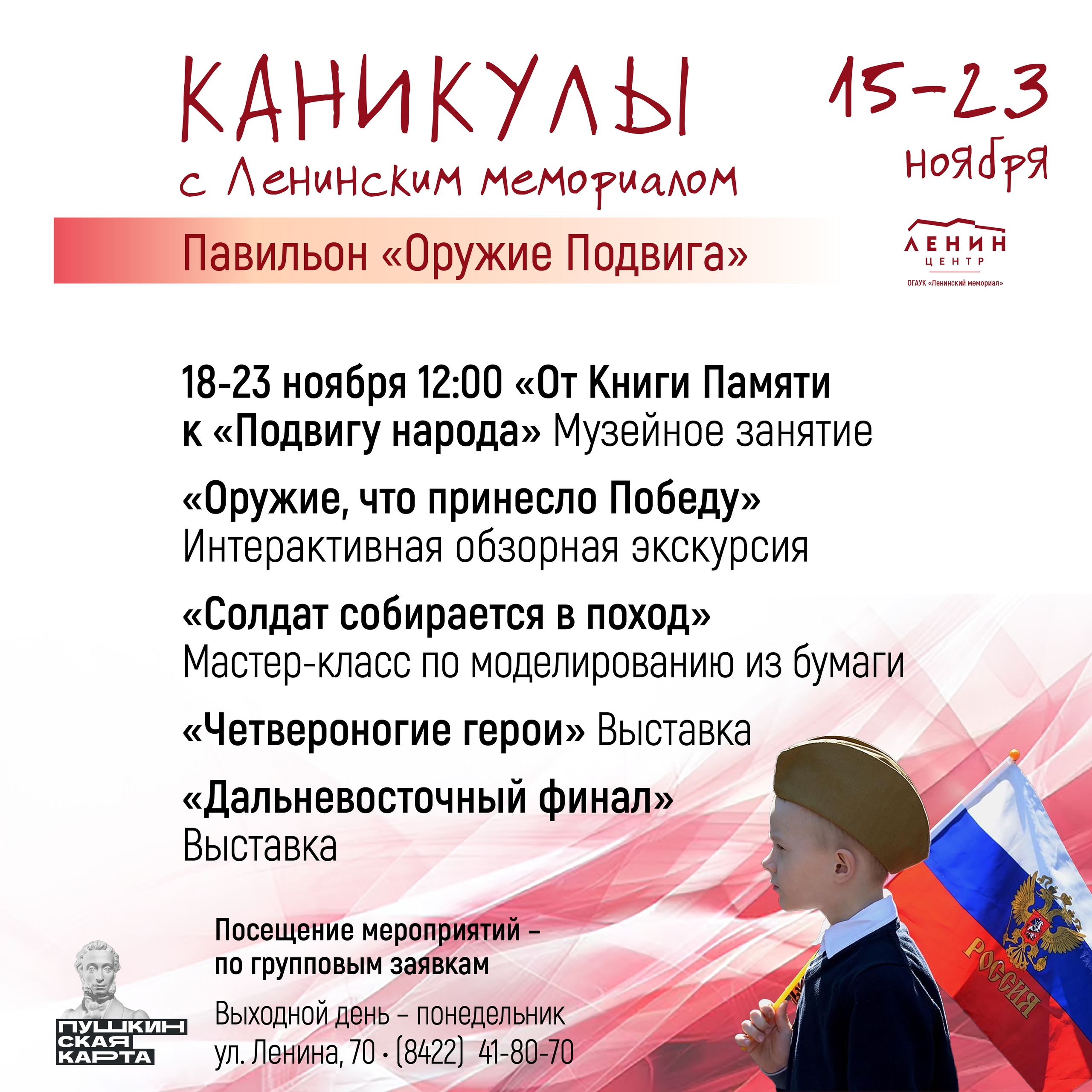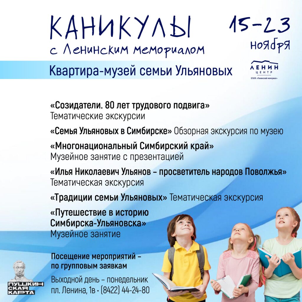 📣 Дорогие ребята! Уважаемые родители! Приглашаем вас посетить музеи Ленинского мемориала в дни предстоящих каникул! 📖 Вас ждут интересные экскурсии, интерактивные выставки, познавательные музейные занятия, викторины! Проведем школьные каникулы с музеями Ленинского мемориала! ✅ Действует Пушкинская карта. |