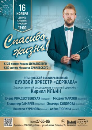 Алёна Тюрина (вокал) Программу представляет заслуженный работник культуры России Лариса Куфтина В 2025 году вся страна отмечает юбилей выдающегося композитора, песни которого обожают миллионы. 80 лет народному артисту РФ Максиму Дунаевскому. На его музыке выросли поколения! Его произведения стали подлинным украшением отечественной эстрады, театра и кинематографа. Его знаменитые мелодии большинство из нас знает наизусть, они звучат на праздниках, торжествах, с экранов телевидения… Сегодня Максим Дунаевский помогает раскрывать таланты студентам консерватории и, конечно, сам продолжает писать неповторимую музыку.