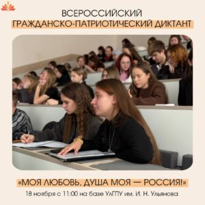🔥 Всероссийский гражданско-патриотический диктант «Моя любовь, душа моя – Россия!» пройдет 18 ноября в УлГПУ им. И. Н. Ульянова 18 ноября с 11.00 до 12.00 на базе УлГПУ пройдёт Всероссийский гражданско-патриотический диктант «Моя любовь, душа моя – Россия!». Ульяновский педагогический университет в очередной раз выступает официальной площадкой проведения Диктанта в нашем городе. Диктант проводит Президентская академия (РАНХиГС) и Научно-образовательная теологическая ассоциация (НОТА) при поддержке Учебно-методического совета по направлению «Государственное и муниципальное управление». Партнером акции выступает «Социальный навигатор» медиагруппы «Россия сегодня». В 2025 году Диктант будет приурочен к проведению в России Года защитника Отечества. Особое внимание уделяется вопросам, связанным с историей, что соответствует стратегическим приоритетам Минпросвещения России по воспитанию у молодежи чувства патриотизма. Это позволит молодым людям продемонстрировать эрудицию в сфере религии, культуры, истории и права, а также задуматься над такими понятиями, как патриотизм и гражданская идентичность. «Целями диктанта является формирование гражданской идентичности и патриотического сознания у молодого поколения, а также выявление ценностных ориентаций современной молодёжи. В рамках мероприятия участники не только выполняют задания, но и отвечают на вопросы социологического опроса, который помогает изучить их взгляды на патриотизм и другие важные аспекты», В этом году к диктанту могут присоединиться не только студенты вузов и колледжей, но и ученики 9-11 классов, а также все желающие. Участники смогут пройти задания Диктанта с 10:00 18 ноября по 10:00 19 ноября. Задания откроются 18 ноября с 10:00 по Московскому времени. 🔥В диктанте можно принять участие и в режиме онлайн по ссылке на официальной странице проекта . |