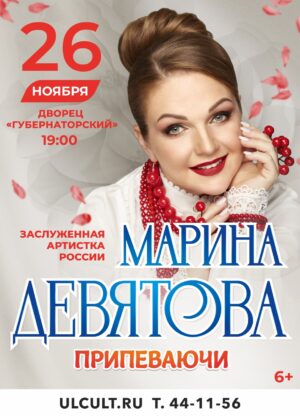 Дорогие друзья! Хотите провести незабываемый вечер на позитиве и в компании добрых друзей?! Приглашаем вас на сольный концерт популярной певицы Марины Девятовой! Заряд душевности и хорошего настроения вам обеспечен! А что может быть лучше любого лекарства? Только добрые мысли и приятная атмосфера. Марина споёт для вас своим чарующим голосом всё самое любимое: от романса до классики, от залихватской народной песни до любовной лирики. Кто хоть раз услышал Марину, как она поёт и вкладывает душу в своё творчество, тот уже навсегда становится ее поклонником. Молодая, озорная, красивая, талантливая певица всех примет в свой круг и вместе с ней вы проведёте незабываемый сказочный вечер!