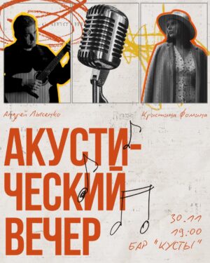 Приглашаем вас на тёплый камерный вечер, где живой музыкой вас будут радовать: ▪️ Кристина Фомина — камерный вечер авторской песни-только голос гитары и искренние истории, спетые с душой. ▪️ Андрей Лысенко — акустическая магия, где бас, удары по корпусу, мелодия звучат одновременно на одной гитаре. Инструментальный фингерстайл с перкуссией. Вход за свободные взносы (по желанию) 30.11 | 19:00 | Бар «Кусты» |