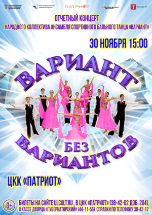 30 ноября в 15:00 в ЦКК «Патриот» состоится концертная программа «Вариант без вариантов» народного коллектива ансамбля спортивногобального танца «Вариант». Дети до 3-х лет при отсутствии отдельного места — бесплатно. При предоставлении свидетельства о рождении (Фото)