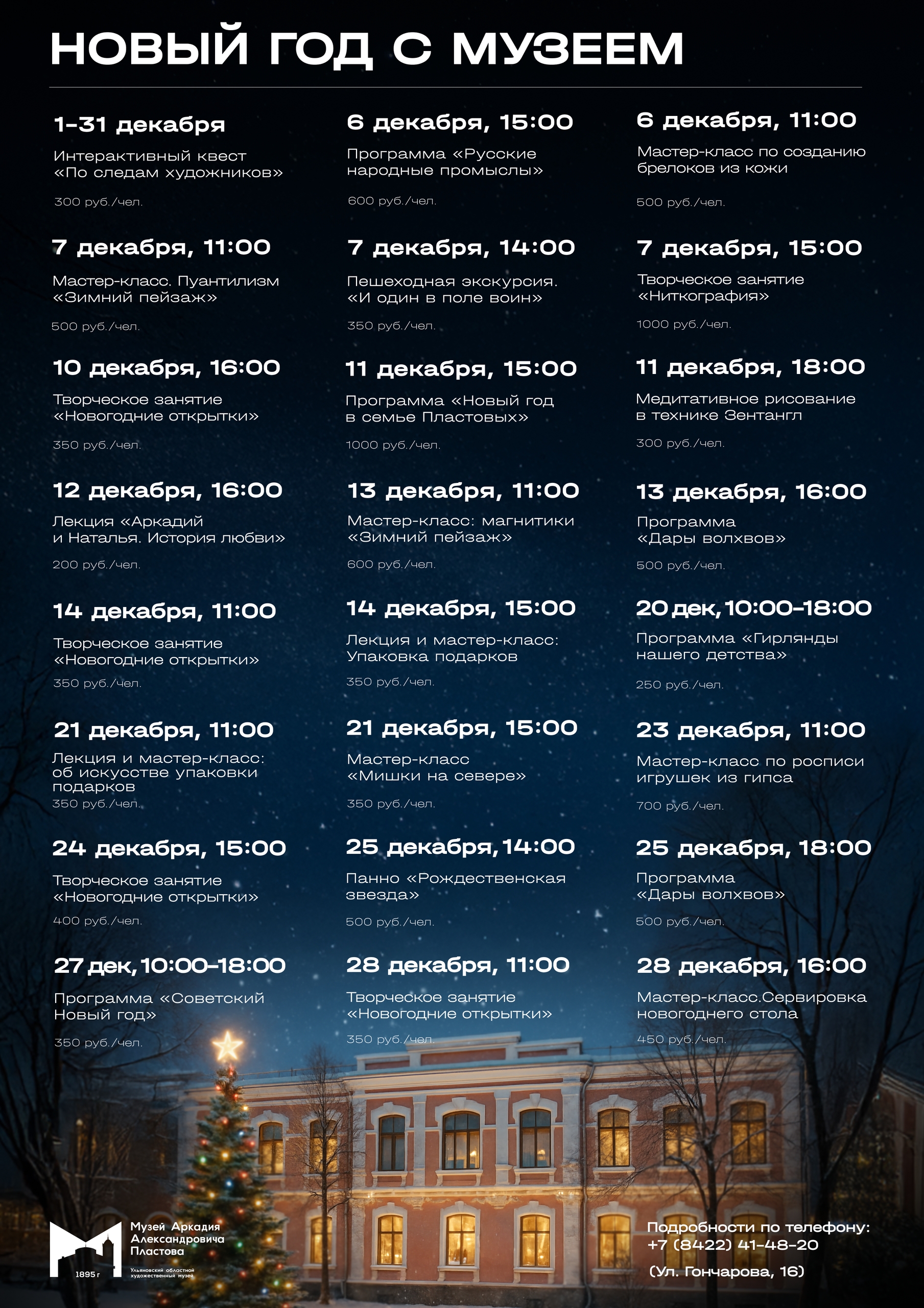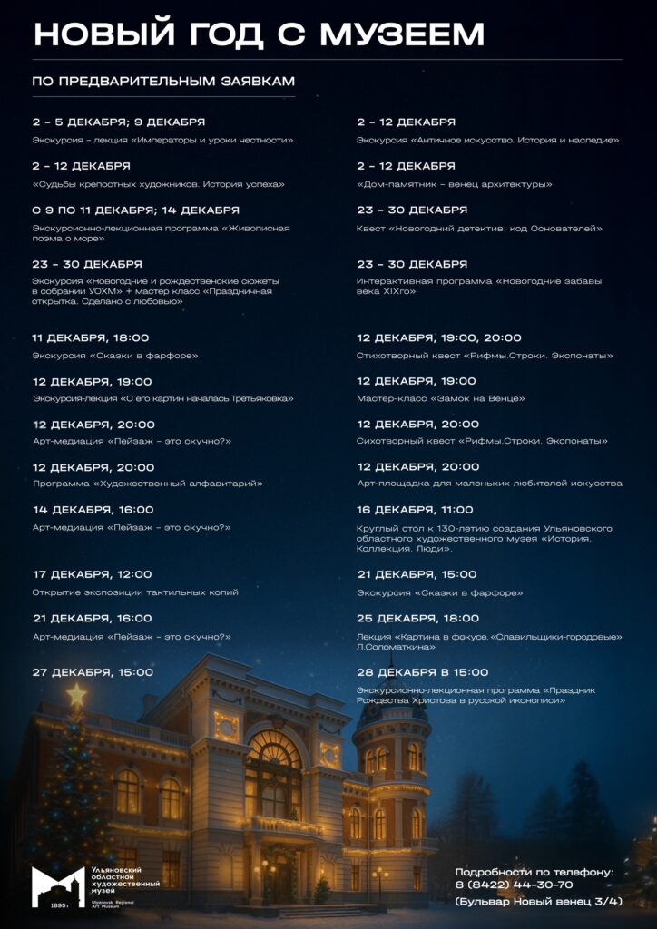 Новогоднее настроение уже в залах! Друзья, декабрь — это время волшебства и вдохновения! Мы подготовили для вас насыщенную программу событий в Ульяновском областном художественном музее (бул. Новый Венец 3/4) и его филиалах: Вас ждут: Создадим праздничное настроение вместе — выбирайте мероприятия по душе и приходите в гости