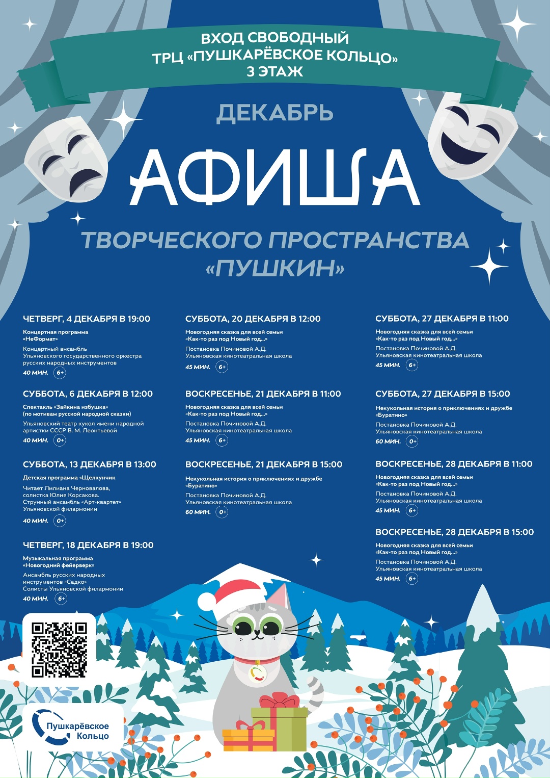 Декабрьская афиша мероприятий творческого пространства «Пушкин» 🎄 ☃️ Четверг, 4 декабря в 19:00 ☃️ Суббота, 6 декабря в 12:00 ☃️ Суббота, 13 декабря в 13:00 ☃️ Четверг, 18 декабря в 19:00 ☃️ Суббота, 20 декабря в 12:00 ☃️ Воскресенье, 21 декабря в 11:00 ☃️ Воскресенье, 21 декабря в 15:00 — Некукольная история о приключениях и дружбе «Буратино». ☃️ Суббота, 27 декабря в 11:00 ☃️ Суббота, 27 декабря в 15:00 — Некукольная история о приключениях и дружбе «Буратино». ☃️ Воскресенье, 28 декабря в 11:00 — Новогодняя сказка для всей семьи «Как-то раз под новый год…» ☃️ Воскресенье, 28 декабря в 15:00 — Новогодняя сказка для всей семьи «Как-то раз под новый год…» 🧡 Мы ждем вас! Вход свободный! ТРЦ «Пушкарёвское кольцо», 3 этаж