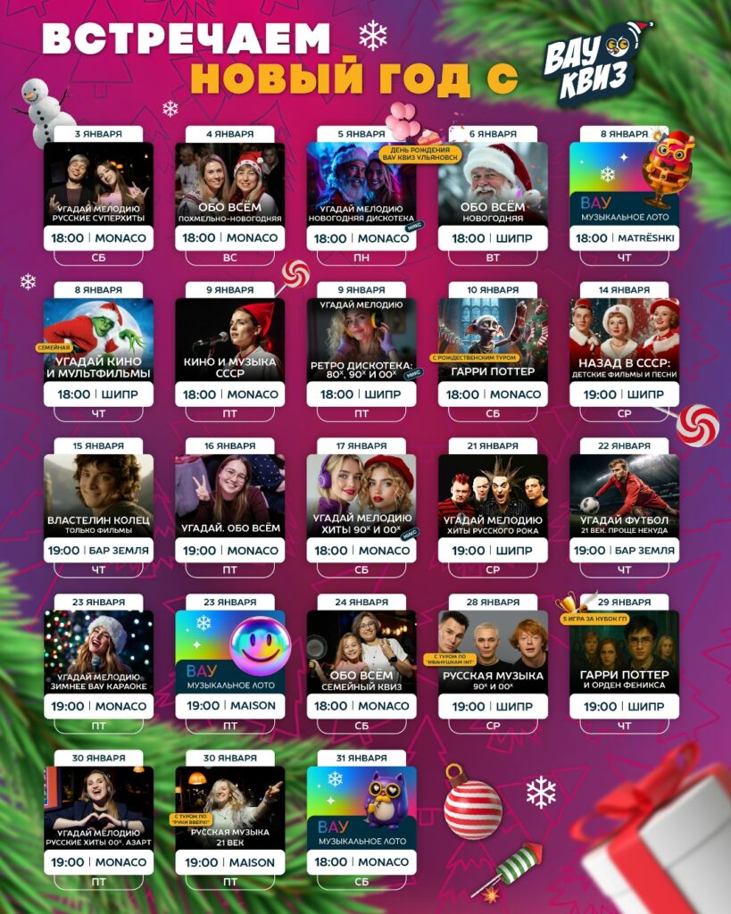✨ Пора! Самое время планировать блистательные и незабываемые вечера в первом месяце 2026 года 🤩 Берем с собой самых близких, друзей или родственников, коллег или соседей. Бронируем заранее места и готовимся к Вау-встречам. Настоящий джингл беллс весь месяц и все новогодние каникулы — это будет весело, музыкально и легендарно! РЕГИ — ulsk.wowquiz.ru/schedule Еженедельно мы разыгрываем бесплатные проходки на игры👇🏻 Итоги розыгрыша будем подводить среди всех выполнивших условия каждый понедельник. Всем удачи и до встречи на Вау Квизе! Больше комментов — больше шансов привлечь внимание нашего рандомайзера 😉 🍷4 января (ВС) 18:00 — Обо всём. Похмельно-Новогодняя в «Monaco» (Ульяновский проспект, 17а) 🎂5 января (ПН) 18:00 — Угадай мелодию. Новогодняя дискотека. Микс / День рождения ВАУ КВИЗ Ульяновск 3 года в «Monaco» (Ульяновский проспект, 17а) 🎂6 января (ВТ) 18:00 — Обо всём новогодняя. День рождения ВАУ КВИЗ Ульяновск 3 года в «Шипр» (Карла Маркса ул. 13а) 💥8 января (ЧТ) 18:00 — ВАУ музыкальное ЛОТО «Клуб Matrëshki» (Карла Маркса, ул. 12к3) 🍿8 января (ЧТ) 18:00 — Угадай кино и мультфильмы. Семейная в «Шипр» (Карла Маркса ул. 13а) 🎄9 января (ПТ) 18:00 — Кино и музыка СССР в «Monaco» (Ульяновский проспект, 17а) ☃9 января (ПТ) 18:00 — Угадай мелодию. Ретро дискотека: 80, 90 и 00. Микс в «Шипр» (Карла Маркса ул. 13а) ⚡10 января (СБ) 18:00 — Гарри Поттер с Рождественским туром в «Monaco» (Ульяновский проспект, 17а) 🎞 14 января (СР) 19:00 — Назад в СССР: детские фильмы и песни в «Шипр» (Карла Маркса ул. 13а) 🧝♂️15 января (ЧТ) 19:00 — Властелин колец. Только фильмы в «Бар Земля» (Карла Маркса ул. 13) 🧠16 января (ПТ) 19:00 — Угадайка Обо всём в «Monaco» (Ульяновский проспект, 17а) 💿17 января (СБ) 18:00 — Угадай мелодию. Хиты 90 и 00. Микс в «Monaco» (Ульяновский проспект, 17а) 🎸21 января (СР) 19:00 — Угадай мелодию. Хиты русского рока в «Шипр» (Карла Маркса ул. 13а) ⚽️22 января (ЧТ) 19:00 — Угадай футбол. 21 век. Проще некуда в «Бар Земля» (Карла Маркса ул. 13) 🎤23 января (ПТ) 19:00 — Угадай мелодию. Зимнее ВАУ караоке в «Monaco» (Ульяновский проспект, 17а) 🧨23 января (ПТ) 19:00 — ВАУ музыкальное ЛОТО в «MAISON» (Московское шоссе 100Б) 😻24 января (СБ) 18:00 — Обо всём. Семейный квиз «Monaco» (Ульяновский проспект, 17а) 🪩28 января (СР) 19:00 — Русская музыка 90 и 00 (с туром по «Иванушкам Int») в «Шипр» (Карла Маркса ул. 13а) ⚡️29 января (ЧТ) 19:00 — Гарри Поттер и Орден Феникса 5 игра за кубок ГП в «Шипр» (Карла Маркса ул. 13а) 💿30 января (ПТ) 19:00 — Угадай мелодию. Русские хиты 00х. Азарт в «Monaco» (Ульяновский проспект, 17а) 🎶30 января (ПТ) — 19:00 Русская музыка 21 век (с туром по «Руки ВВерх!») в «MAISON» (Московское шоссе 100Б) 🔥31 января (СБ) -18:00 ВАУ музыкальное ЛОТО в «Monaco» (Ульяновский проспект, 17а) Мы не знаем точно, где живет Дед Мороз, но ваши яркие впечатления ждут на сайте ulsk.wowquiz.ru/schedule