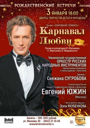 ✨Солист программы «Карнавал любви» — золотой тенор России Евгений Южин (Москва). Евгений учился в Школе искусств по классу аккордеона, но твёрдо решил заниматься вокалом. Окончив Одесскую консерваторию в классе народного артиста Украины А.Т. Капустина в 1998 году, он дебютировал и победил на международном музыкальном фестивале «Italian magic» в Венеции (Италия). После этого последовала череда побед на международных конкурсах и фестивалях в Украине, Болгарии, России, Великобритании. Всё это время Евгений активно гастролировал. В 2005 года началось творческое сотрудничество певца с известным петербургским коллективом двойным дуэтом «Ма.Гр.Иг.Ал». Публика имела возможность наслаждаться результатами этого сотрудничества в Санкт-Петербурге, Москве, Милане (Италия), Шанхае (Китай). В 2007 году музыканты осуществили совместный релиз первого альбома «RUSSIAN». С 2006 года Евгений регулярно принимает участие в программах «Романтика романса» на телеканале «Культура», в телевизионных концертах «Весна романса» и «Праздник романса» на телеканале «СТО-ТВ». В 2013 году Евгений с отличием окончил Санкт-Петербургскую государственную консерваторию им. Н.А. Римского-Корсакова (отделение «Оперное искусство», класс Карпова Д. В.). В репертуаре певца — произведения различных стилей и направлений: русский романс, советская эстрада, неаполитанские песни и романсы, классическая камерная музыка, оперное искусство. Есть и авторские произведения, некоторые из них написаны самим музыкантом, некоторые — народным артистом России и Украины Александром Морозовым, Андреем Медведевым, Игорем Корнелюком и другими композиторами. В октябре 2010 года в российский прокат вышел масштабный российско-американский проект — фильм «Правосудие волков» по роману В. Кунина «Мика и Альфред» с Майклом Йорком в главной роли, саундтрек для которого спел Евгений Южин (музыка Игоря Корнелюка). Интерес к творчеству Евгения Южина растёт с каждым годом: его плотные гастрольные туры охватывают всю Россию, его ждут с концертами за рубежом, его выступления транслируются по телевидению с завидным постоянством. 3 января артист выступит с Ульяновским государственным оркестром русских народных инструментов под управлением Снежаны Сугробовой на концерте проекта «Очарование романса». Программу представит Элла Якубенкова. 📍3 января, 18:00, Дворец творчества детей и молодёжи 💳Приобрести билеты можно на сайте Ленинского мемориала clck.ru/3QeWXM |